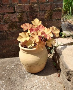 Back at the front, a stalwart heuchera has once again weathered the few cold spells in the winter past and looks braced for another sizzling summer. It’s the only front plant that never had to be moved. I moved the ponytail palm from its winter spot in the living room to the front walk for the next seven months. When I received it as a gift twenty-eight years ago, I plunked it into a concrete planter my grandfather had given me from his garden. It has grown tall and thrived in that same cramped planter ever since; I don’t dare repot it.