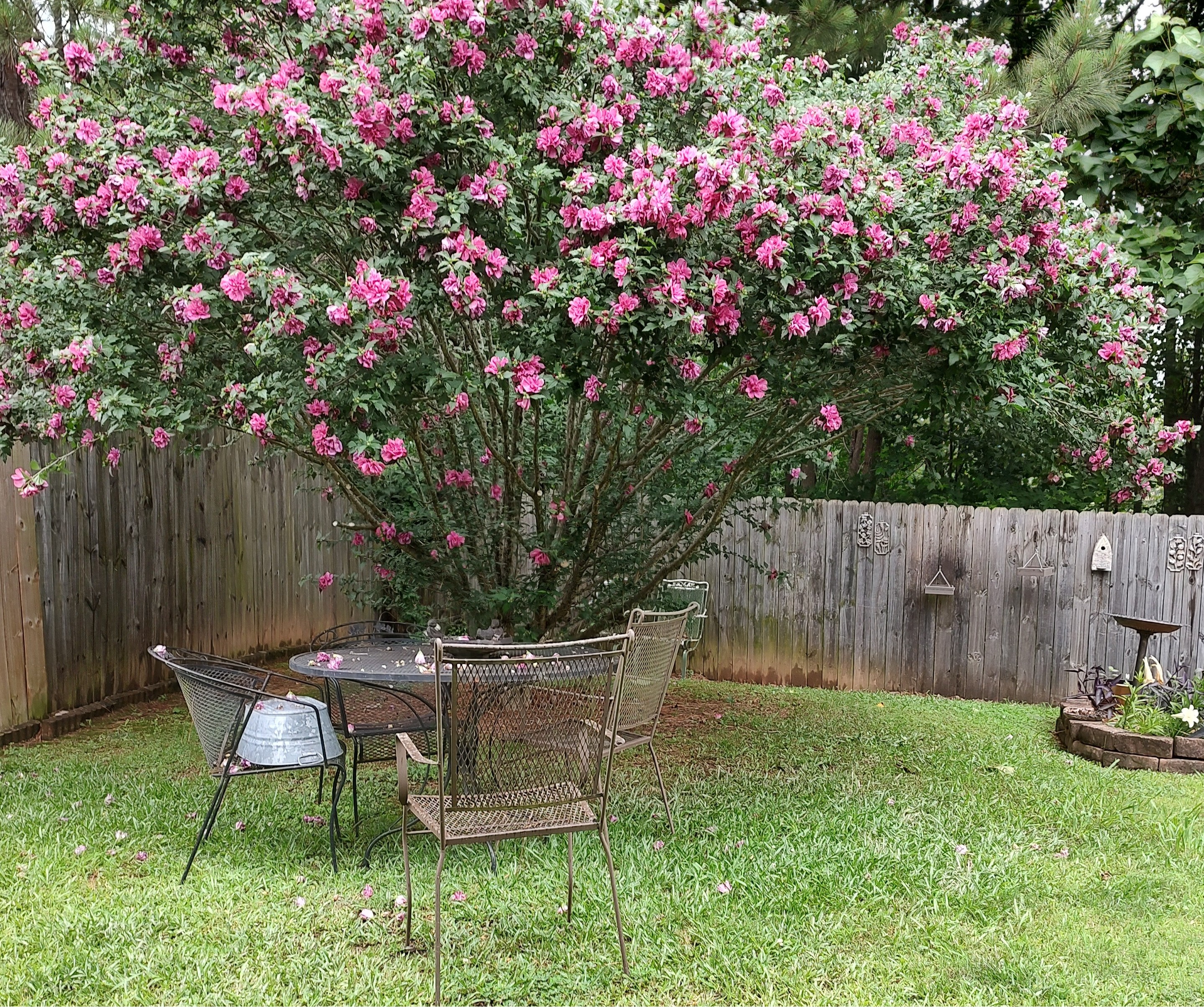 No matter how I try, the Spring plantings that I took such pride in “look like August” after the harsh heat of July and August. Plants that once bloomed prolifically look a little spare, the petunias (which I never really cared for to begin with) are faded and leggy. Even the Peggy Martin “Katrina” rose looked like it might die a few days ago; it’s springing fresh leaves again and might still manage a fall bloom. The lantana soldiers on but didn’t flower quite as much in the hottest heat; that’s okay, since I like the citrusy fragrance of lantana leaves even more than the flowers. I still have a hard time believing that lantana is an invasive species elsewhere. The hibiscus, a slow starter, seems to flourish in the heat.