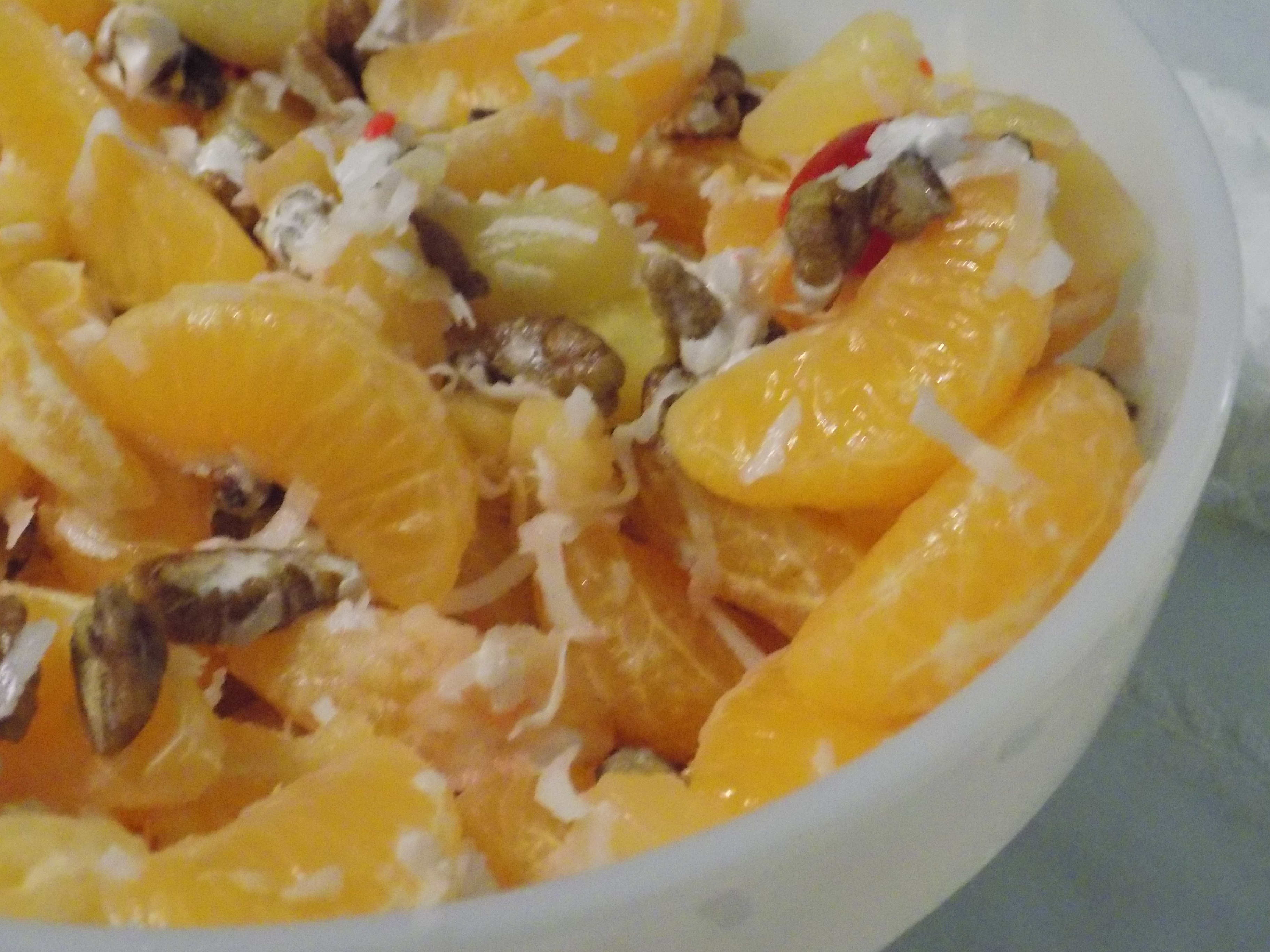 My own ambrosia is in a state of constant flux, based on memories of my Grandmother Journey’s version, adaptations of chef Scott Peacock’s elegant recipe, and various others I have tasted. My own version today includes satsumas, pineapple chunks, shredded coconut, pecan pieces, and – in lieu of the miniature marshmallows so often used in a Southern ambrosia – I mixed in a bit of fluffy marshmallow crème. One final touch is a few cherry halves sprinkled in for color as much as anything. The cherries are not necessary but I seem to recall them from ambrosias past.