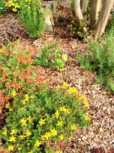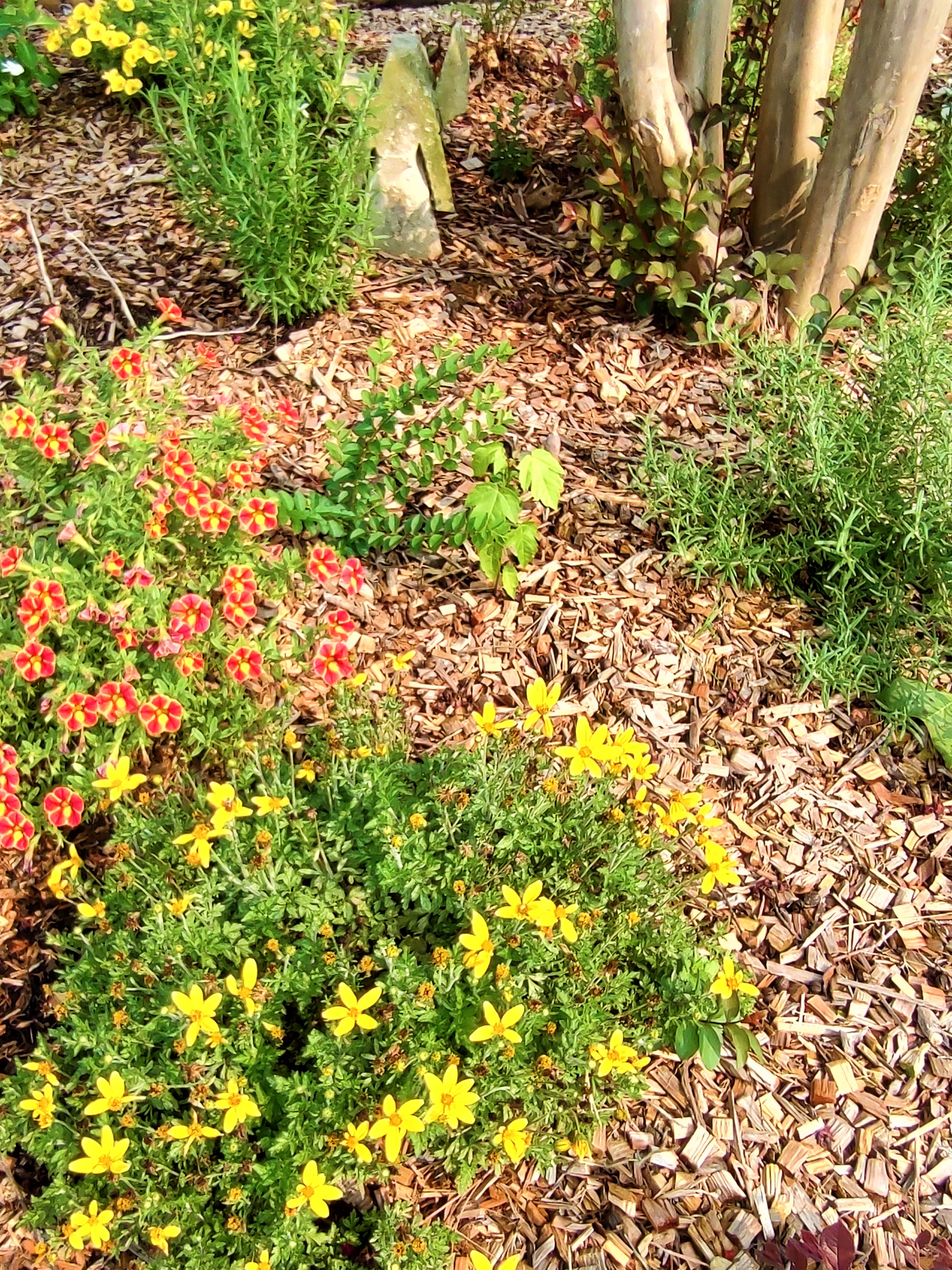 A late freeze brought the demise of a large loropetalum shrub encircling a tall crape myrtle in Mother’s front yard. When the loropetalum was removed, we decided to plant a variety of blooming and leafy plants in its stead. It turned out to be a good move – with compact bidens, calibrachia, rosemary, vinca, and Japanese painted ferns putting on a frisky, flourishing show beneath the deep crimson blooms of the crape myrtle. I keep a careful watch over the volunteers – some are welcome; others will take over if left alone.
