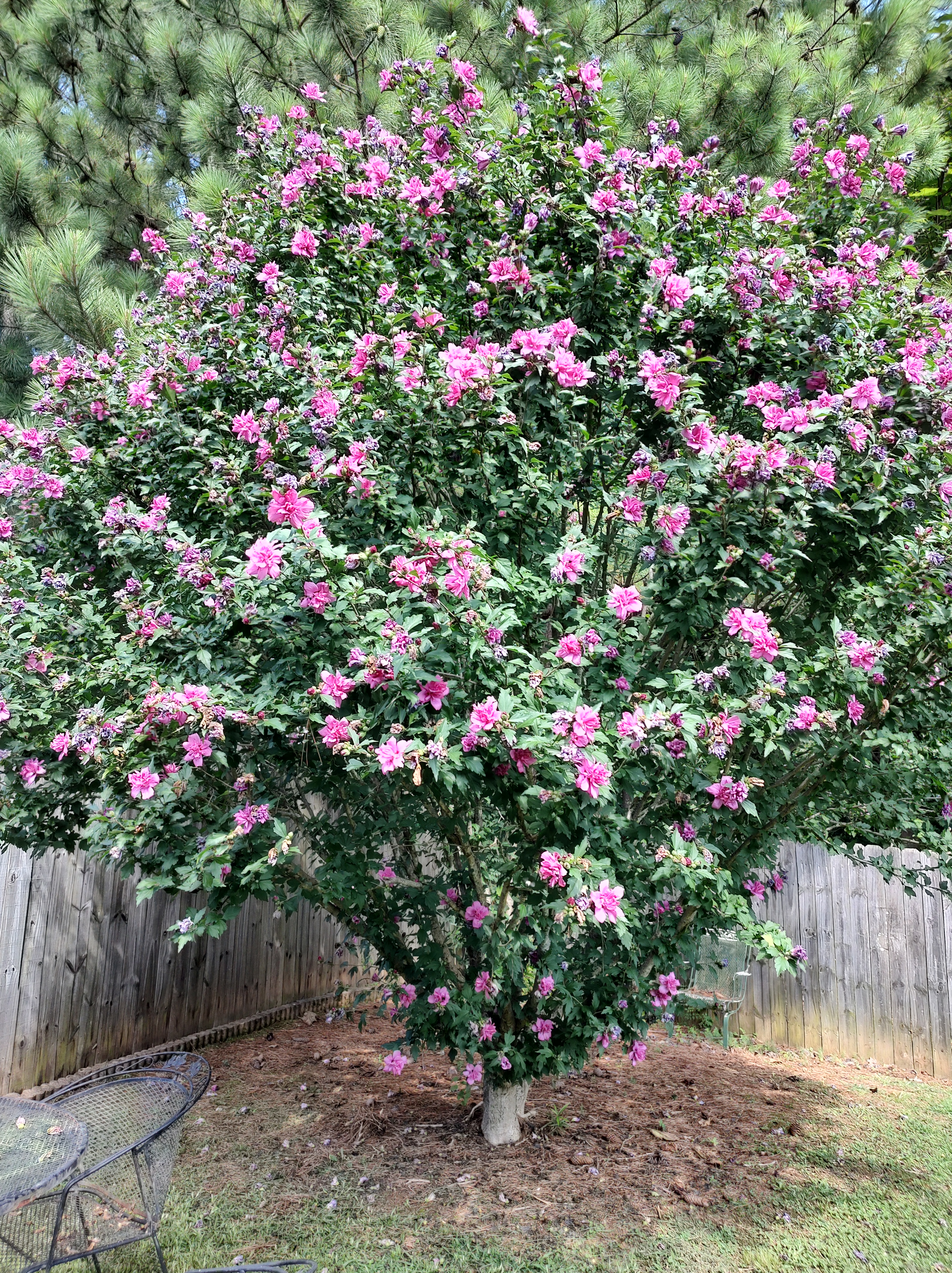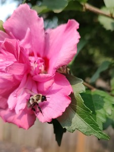 But here’s the kicker: There’s a Rose of Sharon in my parent’s backyard that grew from a sprout and is probably in excess of twelve feet now. It’s covered with fuchsia blooms and – at any given time – hundreds of bees. I know Rose of Sharon is a common name used for a number of plants – this one is a hibiscus – but I like the tradition and antiquity of the appellation and plan to use it until the plant police come knocking. Bees have always loved this specimen, but this year seems to be a banner year for its bee population from early morning to sunset. There is a constant low buzz from the tree when we wander into the yard.