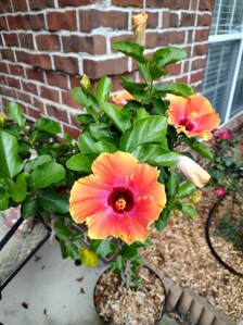 As you come into the entry space, a ruellia – commonly called a “wild petunia” and known for an invasive nature – stands confined in a container, grounded by impatiens and lysimachia. Its delicate morning blooms fall off daily, to be replaced by new blooms the next morning. The roses in a bed next to the house have seen better days, but they are hanging in there. Bees, butterflies, and the occasional hummingbird show up and regular rainfall and diligent watering are keeping everything happy so far in the stifling July heat.