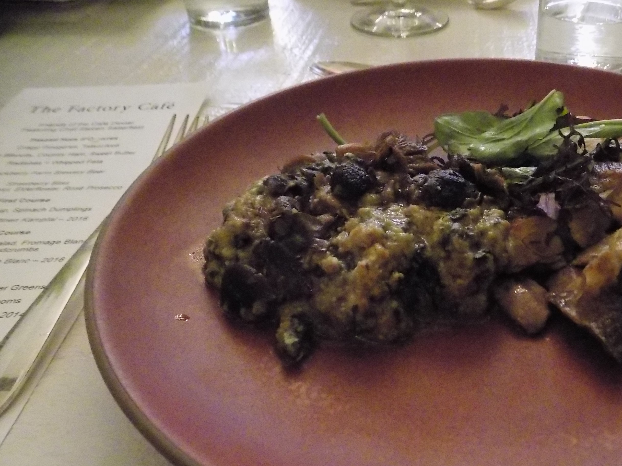 The main course, served family style, featured a perfectly prepared and crusted guinea hen with Dijon-herb jus. The hen was presented with bitter greens and polenta with nettles and mushrooms. The guinea was a big hit at my table with diners quickly reaching for the platter and second helpings.