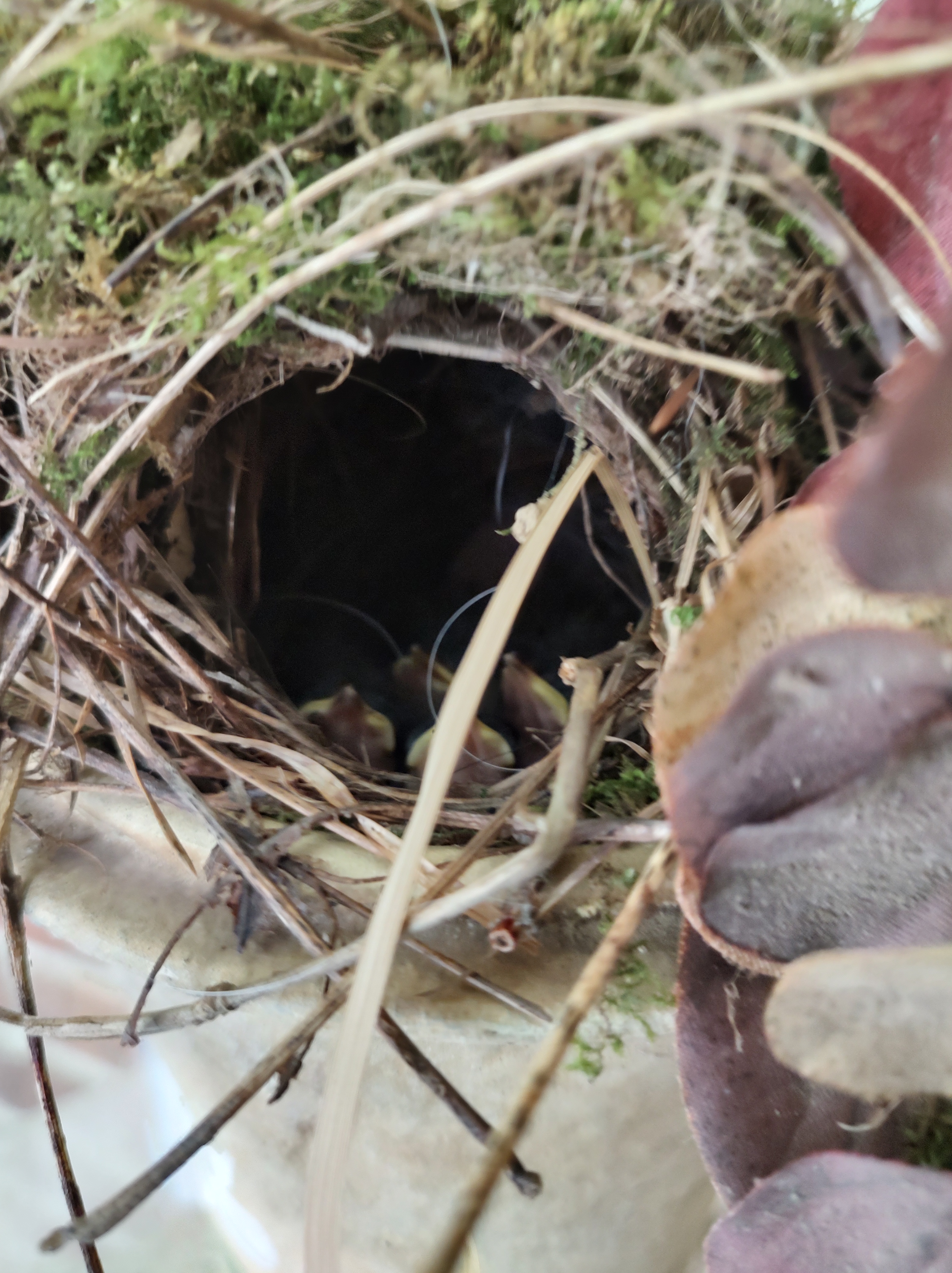 The next day was about the same, with adults going back and forth with food offerings. Sometimes they came out with their beaks empty and other times the food was still in their beak when they left. That night I peeked in the nest again; now, the little bird was still breathing, but was turned away from the nest opening.