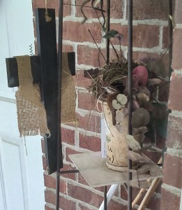 After a couple of frustrating days, the wrens moved on. By the next day, I noticed activity at an empty flower pot on a narrow shelf next to Mother’s back door. Over some busy days, the pair of wrens constructed an igloo-shaped nest incorporating natural elements as well as artificial eucalyptus foliage that had been abandoned on the shelf. The narrow shelf had an Easter cross hanging from it and the birds would perch there as they made their entrances and exits at the nest. The nest is a bit of a post-modern showpiece combining found, natural, and people-made elements. Frank Gehry would be proud, I think.