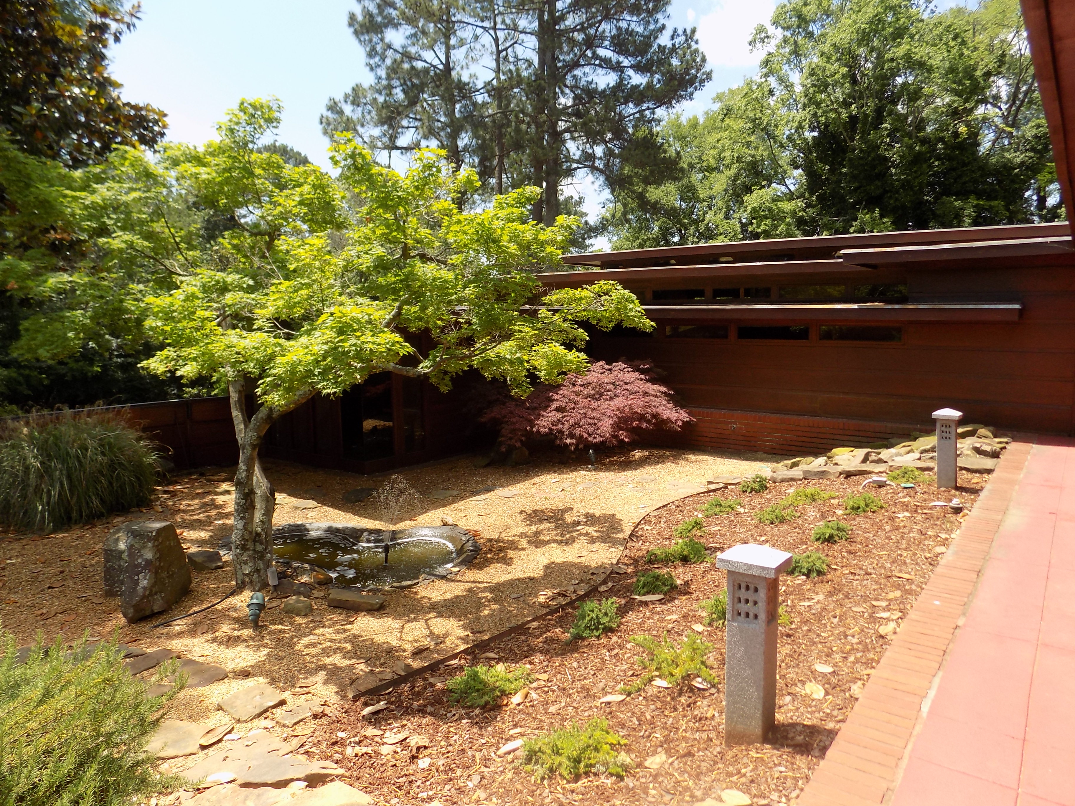 Despite the design flaws, the Rosenbaums treasured their masterpiece and turned to Wright to build an addition when the family outgrew the original space. That 1,084 square foot addition, also L-shaped, incorporates a more spacious kitchen, a guest room, a “dormitory” with bunk beds for the four Rosenbaum boys, and a second cantilevered carport for Mrs. Rosenbaum. The L-shape of the addition embraces a walled Japanese garden.