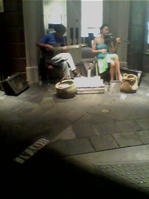After dinner I returned to the hotel. I had a long drive the next day but I walked back down Royal Street and listened to a lovely duo of street performers on the corner of Royal and St. Louis. Tanya and Dorise (www.tanyandorise.com) have attracted a following in the Quarter with their violin and guitar renditions of an amazing array of music. Although they play a little bit of everything, when I last saw them – close to 11:00 p.m. – they were playing contemplative and thoughtful songs like Leonard Cohen’s “Hallelujah” and the Pachelbel “Canon.” When Tanya and Dorise broke into Nirvana’s “Smells like Teen Spirit” the gathering crowd erupted. The mood was shifting again but then a brass band appeared up the street, leading a wedding party and its second line back to the Monteleone. As the second line passed, I took it as a cue to trail behind and return to the hotel myself with the sounds of Tanya and Dorise floating in the sultry air behind me. The brass band dispersed outside the hotel as the last of the wedding party disappeared into the lobby.