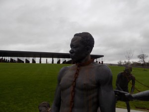 The Memorial sits on a six-acre site overlooking Montgomery. The main structure is entered after taking a winding path up a hill with informational narratives at regular intervals. Upon entering the main structure, the first slabs sit at eye level. There are clearly visible names of counties and states and the victims and lynching date for each. Gradually, the floor begins a gradual rake and the slabs hang over the visitors’ heads, suggesting the hanging bodies of the victims. It’s not hard to recall Maya Lin’s Vietnam Veterans Memorial in Washington, in which the wall starts slowly at your feet and gradually towers over the viewer as one walks deeper into the war.