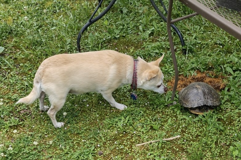 If Lulu heard lightning, or if it rained hard, she would wander around the house until she found a haven, usually in a closet or bedroom. She never sat and ate a meal. She would nibble delicately throughout the day. If she was going out or for a walk, she would grab a few bites of kibble in her mouth, delicately place them on the floor, and eat them one by one. She had a keen sense of smell and would roam the backyard, following the scent of creatures who had wandered through – a rabbit, a raccoon, an opossum, a runaway ferret one time, a tortoise, the neighborhood cat who taunted her from the fence post. She knew there was a chipmunk who lived under the storage shed in the backyard and never went out without sniffing at the place where the chipmunk burrowed under. On walks, she would stop and sniff anything with a scent. The jasmine at a mailbox down the street was a particular favorite.