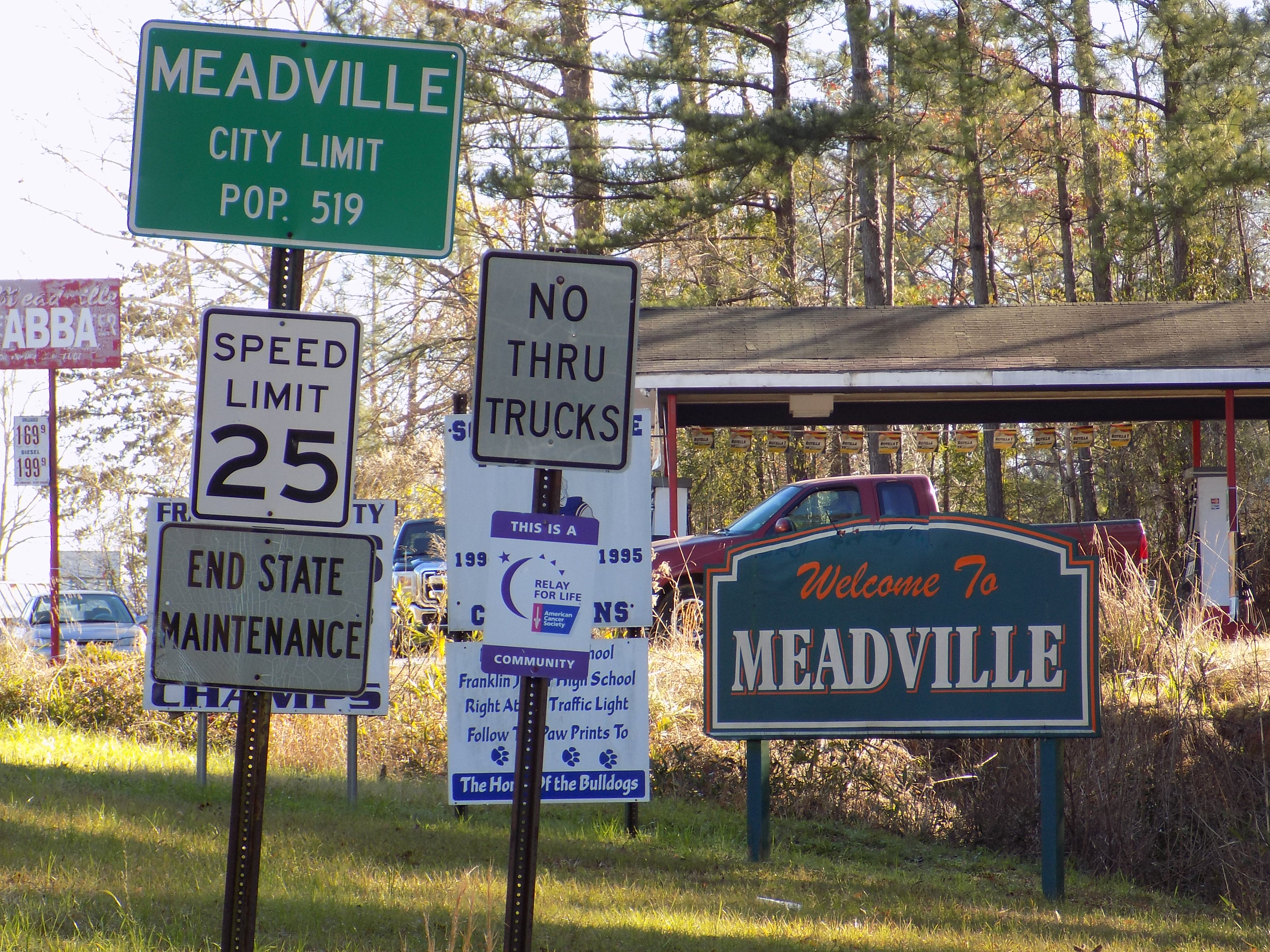 DSCN0070  I refused to turn the radio on as I followed the ambulance in a constant driving rain. I suspected there were tornadoes nearby; if there were, I didn’t want to know. It turns out I was right. And suddenly, after eyes glued to the back of an ambulance for 315 miles, I find myself in Meadville, Mississippi.