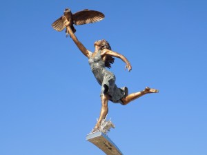 O’Connor’s Minerva is a stunning addition to Tuscaloosa’s riverscape. She is a modernized creation with flowing hair replacing the traditional helmet. Luminous raiment flows against her taut and powerful body. She appears to be landing in water after a flight and her right arm releases an owl into the firmament. The sculpture is not monochrome; a subdued and powerful mix of hues captures and plays with the light, giving the form an even more changeable and human presence. She is inspiring and spectacular.