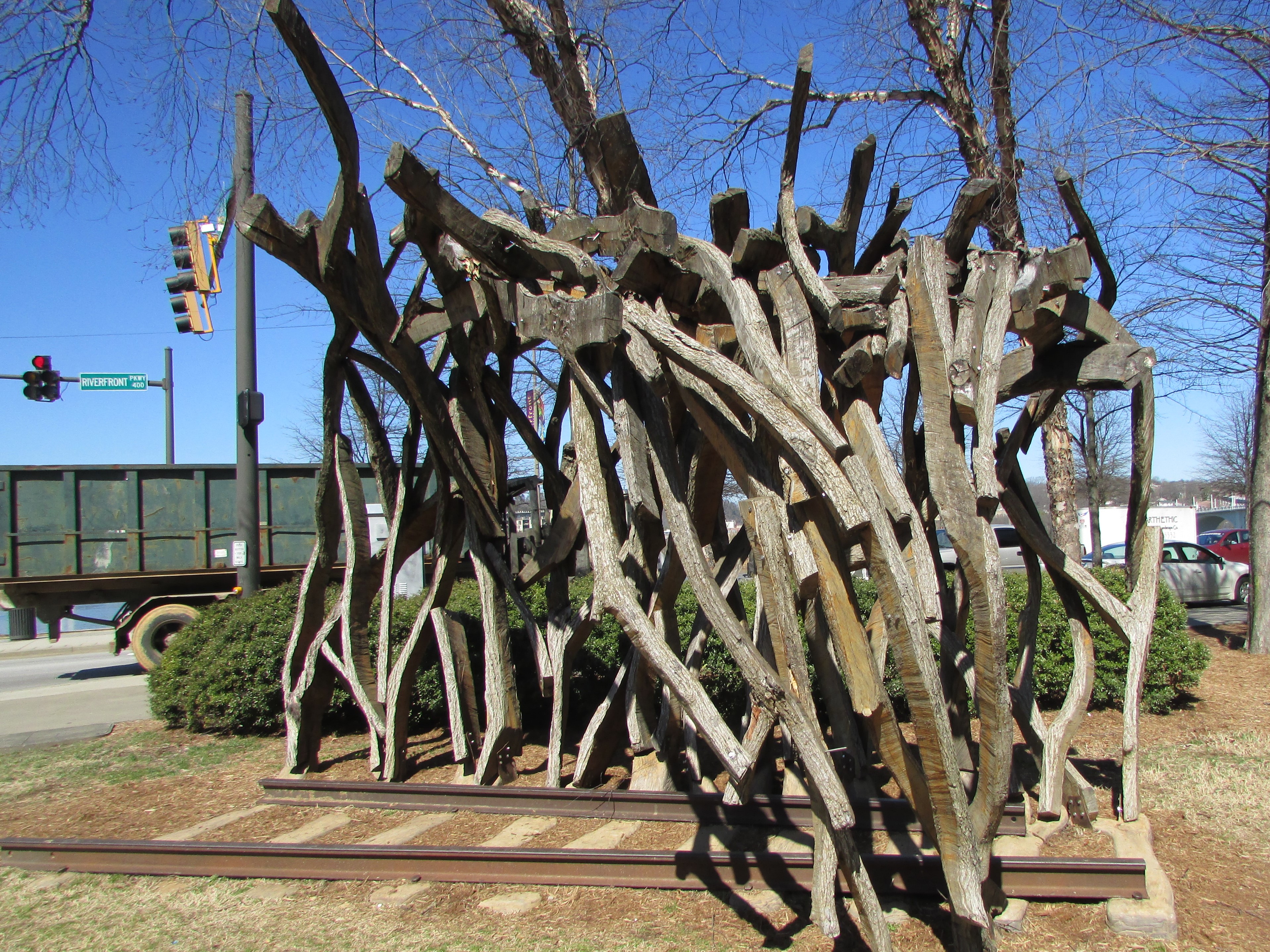 img_1199-2Outdoor installations made from recycled materials are Fennell’s specialty. When I became aware of the artist and his work, I began to run across his pieces as I travelled. “Rail Wave,” beside the river in Chattanooga, features railroad tracks across wooden ties that rise up into a cascading wave tunnel – one of Fennell’s recurring motifs.