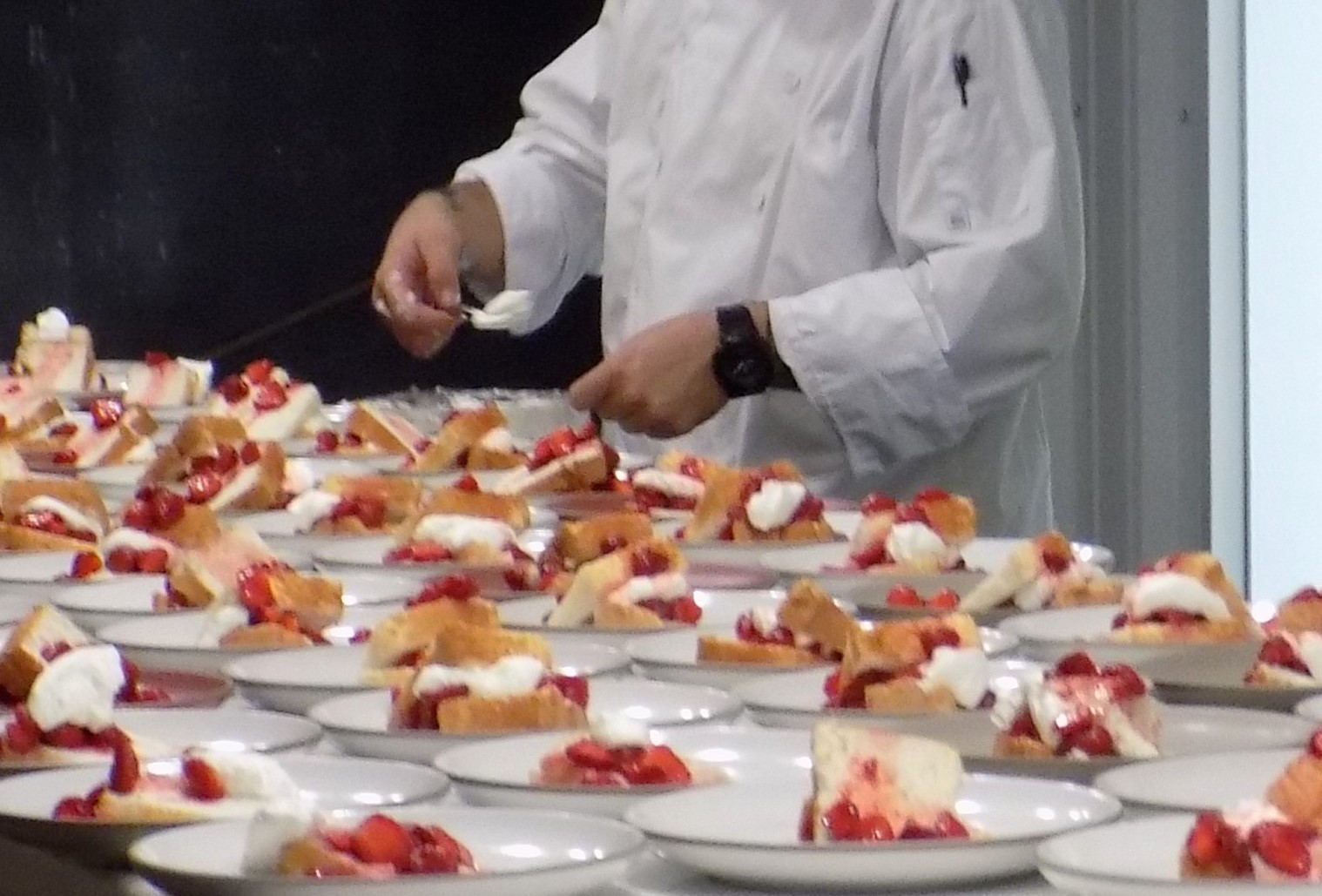 Incidentally, the dessert, a strawberry shortcake with local strawberries macerated in a thyme simple syrup with freshly whipped cream is assuredly the best and freshest I’ve ever tasted. Almost as good as the dessert’s taste was watching Zach Chanin and his staff assembling the dozens of desserts on the café bar.