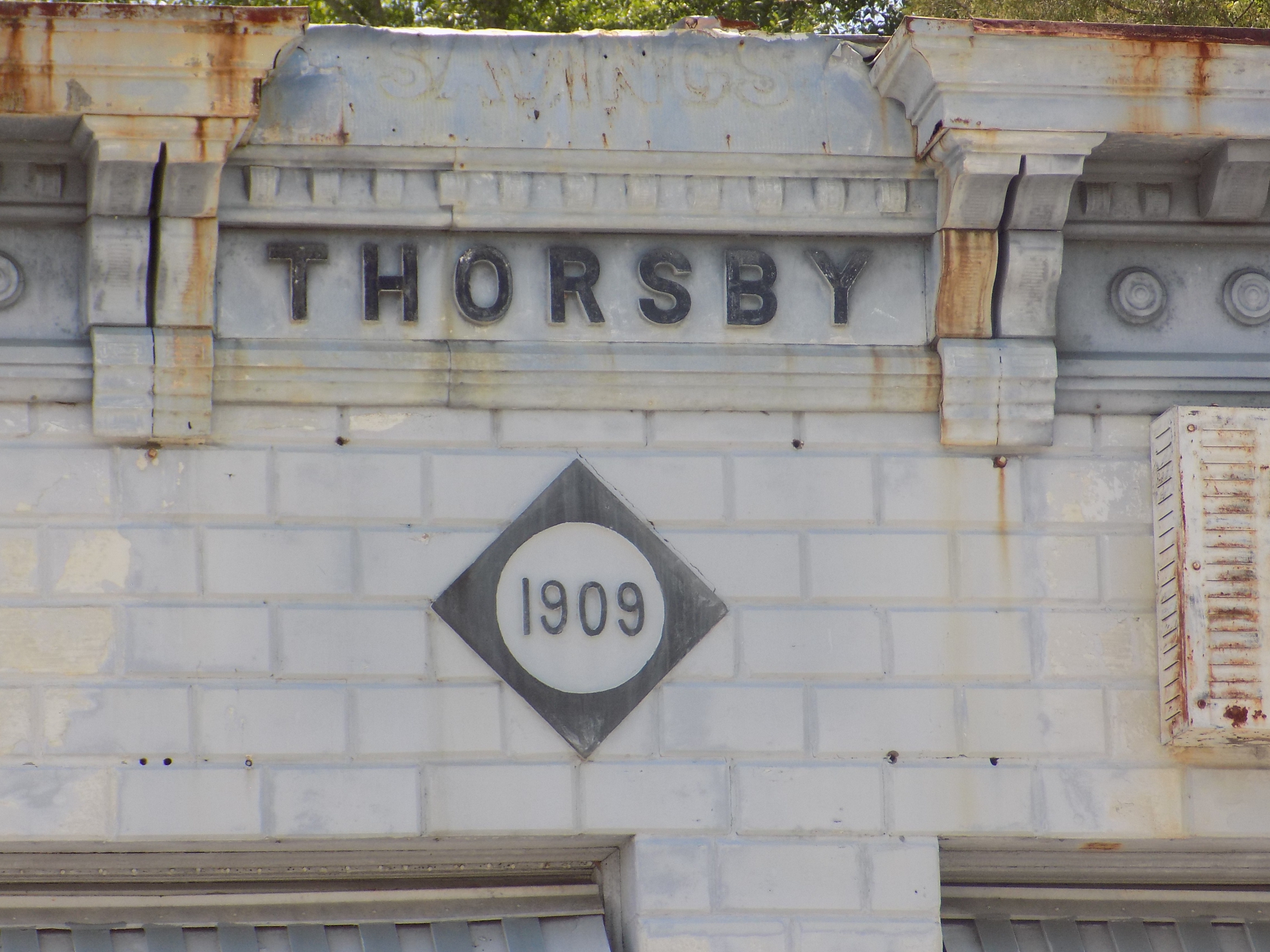 A couple of weeks ago, traveling to Harrison Fruit Farms in Chilton County for my first “peach run” of the season, I became acutely aware of places on the side of the road that I have probably passed hundreds of times over the years. A group of abandoned buildings in Thorsby, Alabama, called out to be photographed. Especially appealing are the ruins of the once stately Bank of Thorsby building, dated 1909. It is in the remaining details – the cornices, the lettering in the windows, the date – that the history is revealed and the legacy is sealed.