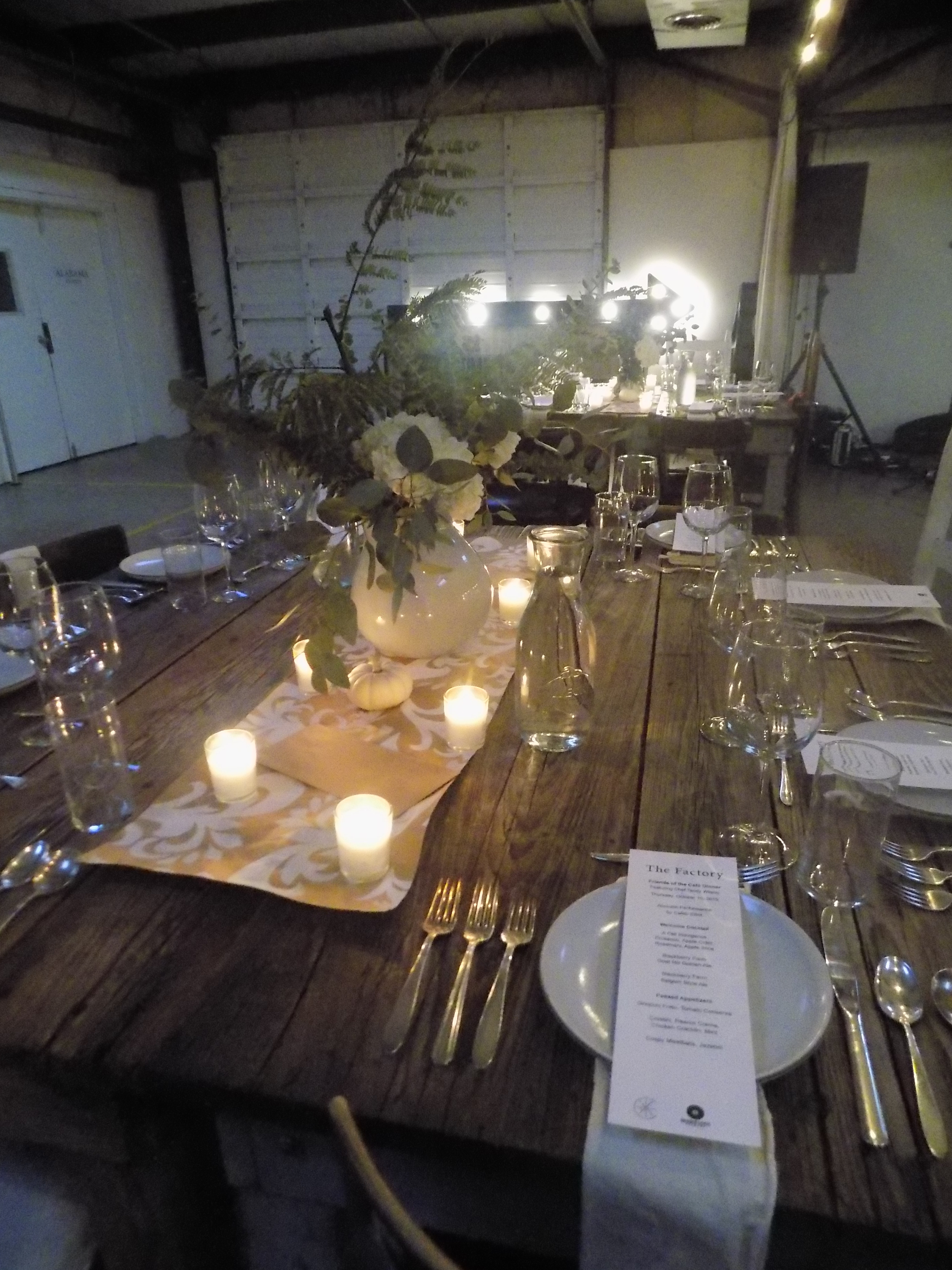 Due to fall’s early sunsets, the inviting fashion showroom and dining area were already dusky and shadowy – the skylights providing scant illumination; the room was mostly lit by the glow of candles from a bevy of tables awaiting a sumptuous feast by guest chef Tandy Wilson.