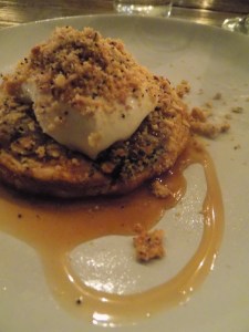 The centerpiece of the third course was a roasted pork loin. Chef Wilson explained that he thinks his version of his Nana’s marinade, which accompanied the pork, was a pretty good recreation of his grandmother’s closely guarded recipe; he confessed, however, that other family members do not agree that his kitchen nailed it. The marinated pork loin was succulent and singular, but the bed it rested on is what caught my attention and intrigued me even more. The room temperature accompaniment to the pork was a multi-textured mix of cauliflower, pomegranate, almond, red onion, and parsley. The mouthfeel of the pork with the chewy crunch of the other ingredients is a food memory I will carry with me for a long time.