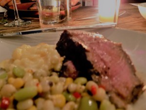 The third course was a perfectly prepared beef ribeye with celery root puree, vinegar-wilted arugula, and chimichurri. The dinner ended with the most elegantly presented Mississippi Mud Pie I have ever tasted. It was a soulful, well-paced meal, pleasingly complemented by Solomon’s pairings.