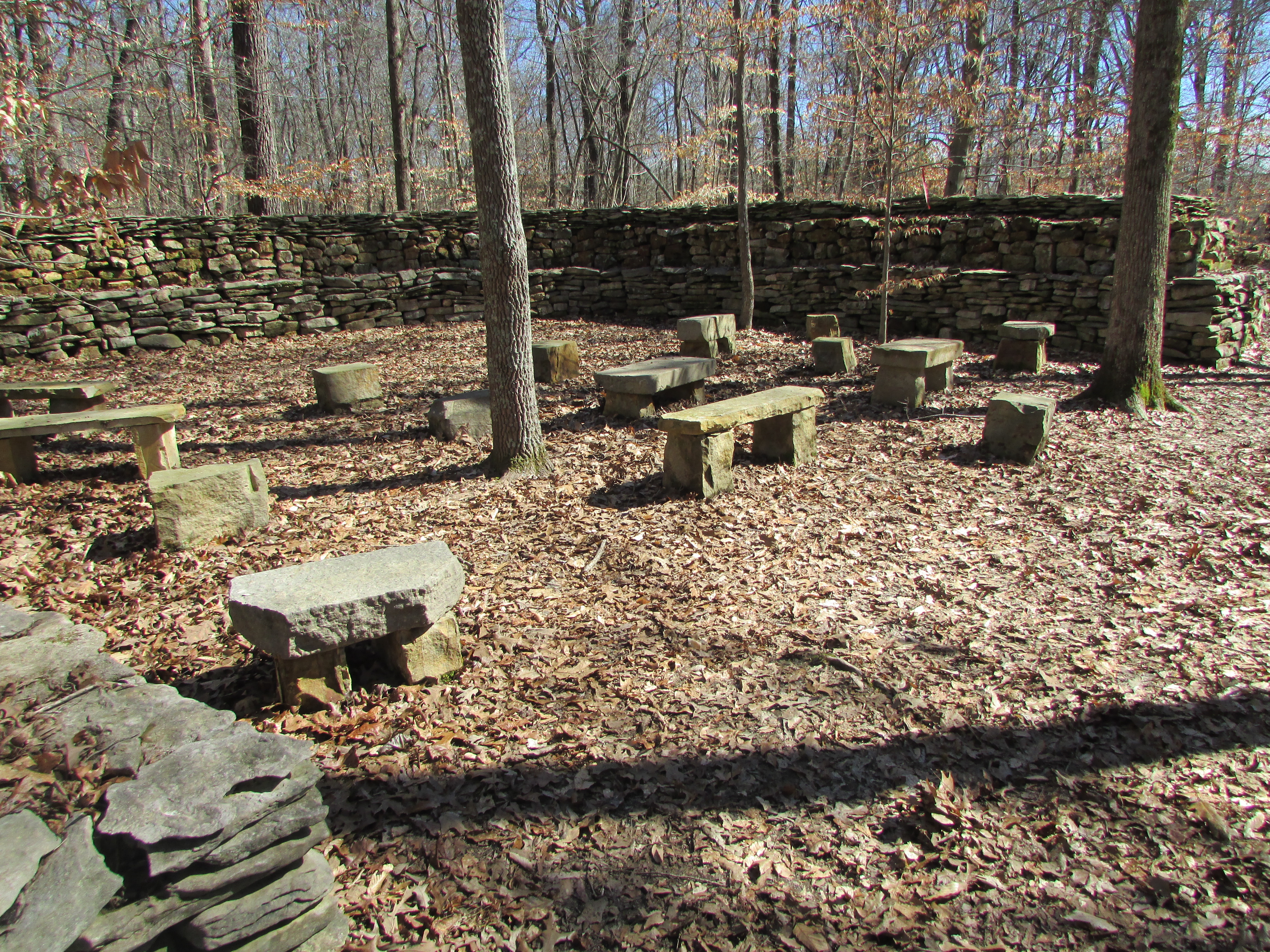 Mr. Hendrix, inspired by the stories and journals passed down through his family, began to build the wall with stones he had brought to the site at his home a few yards from the Natchez Trace. Each stone, he says, represents a step of Te-lah-nay’s journey. Now there are paths along well over a mile of wall, each stone placed by Mr. Hendrix. It is a spiritual and peaceful place with curves, benches, levels, and prayer circles. At some places the wall is high and at other places it is low enough to sit on. At some places it is tight and closed in and at others it opens out. People have sent stones to Mr. Hendrix from all over the world to be placed in the wall. Occasionally a seashell appears along the path.